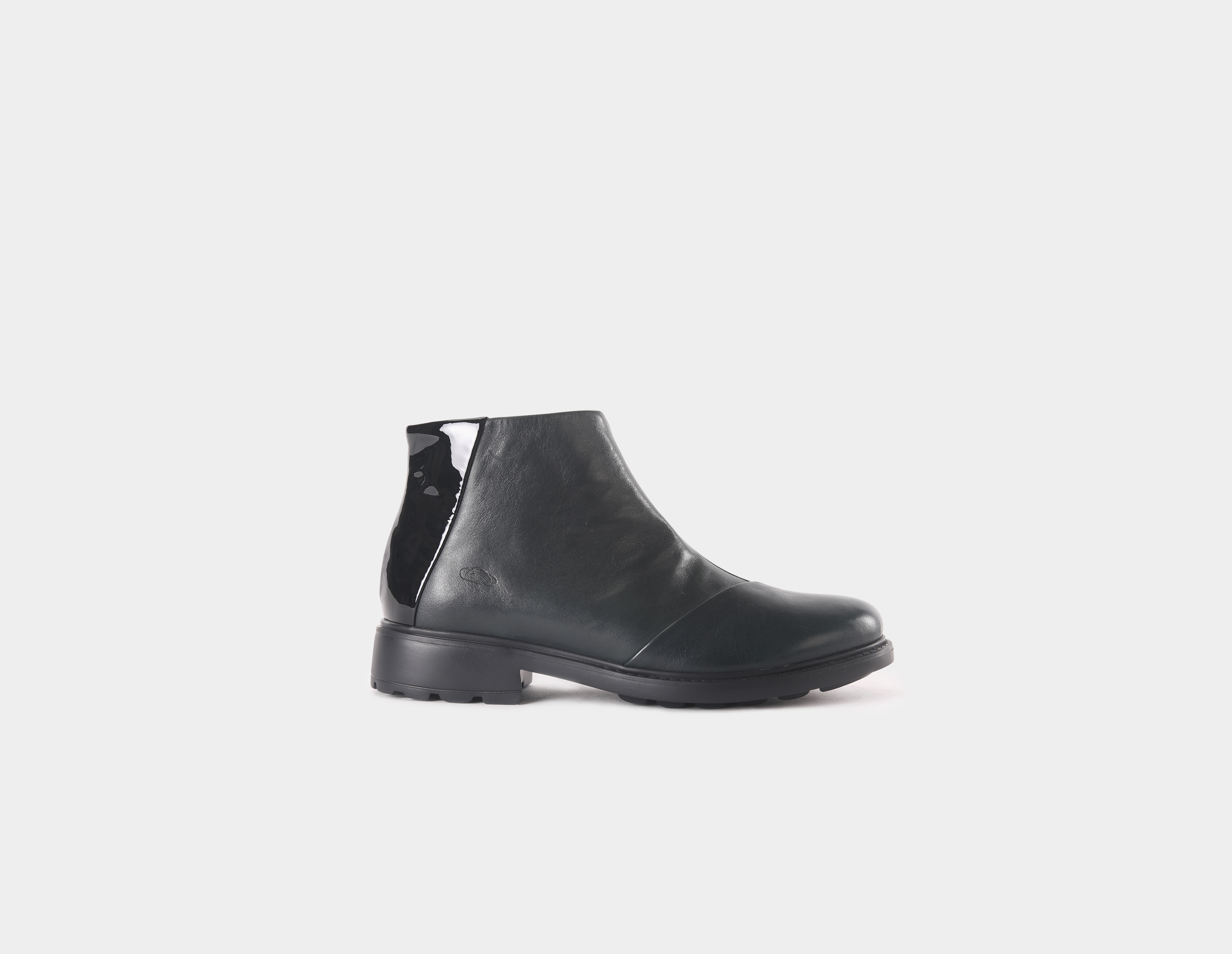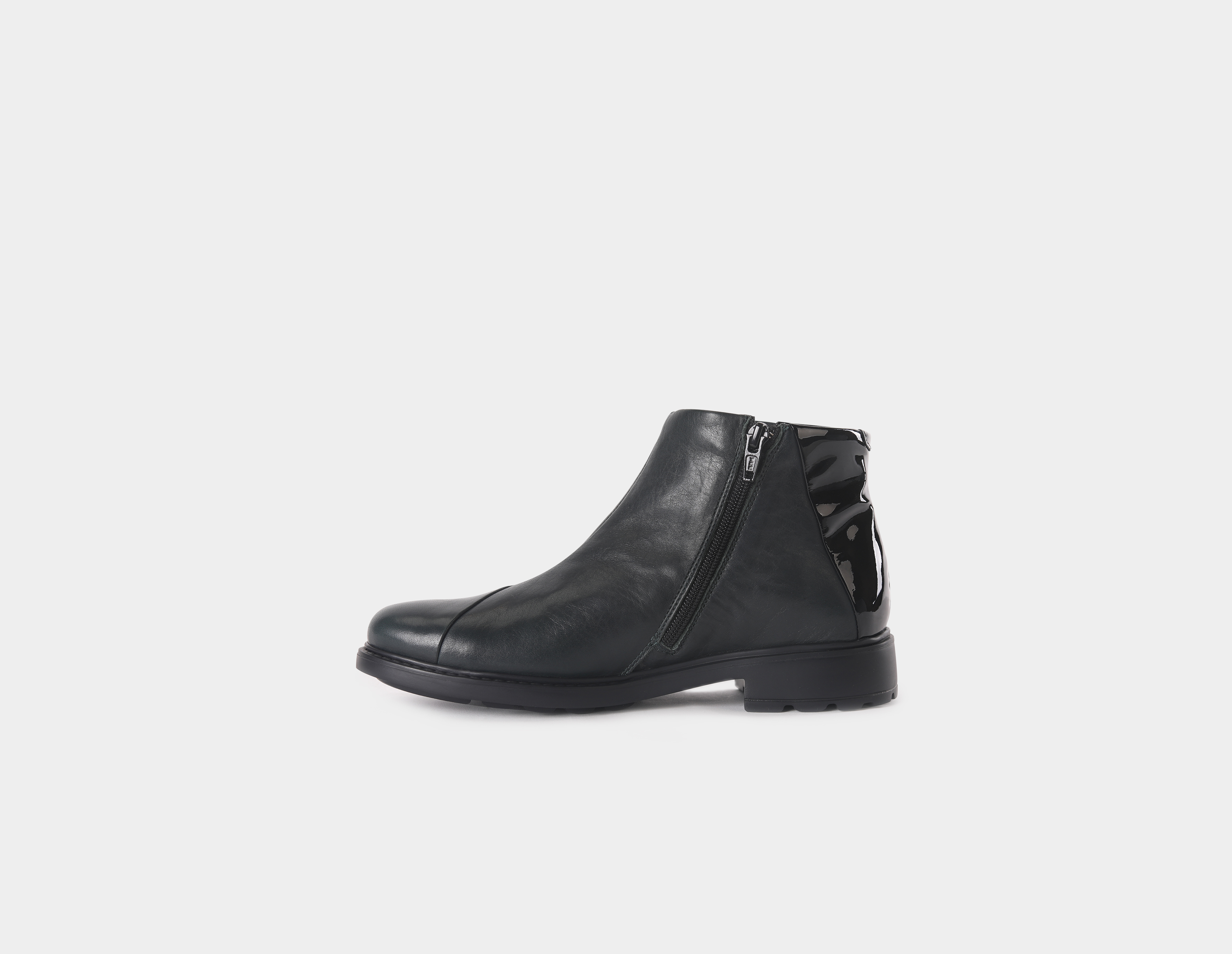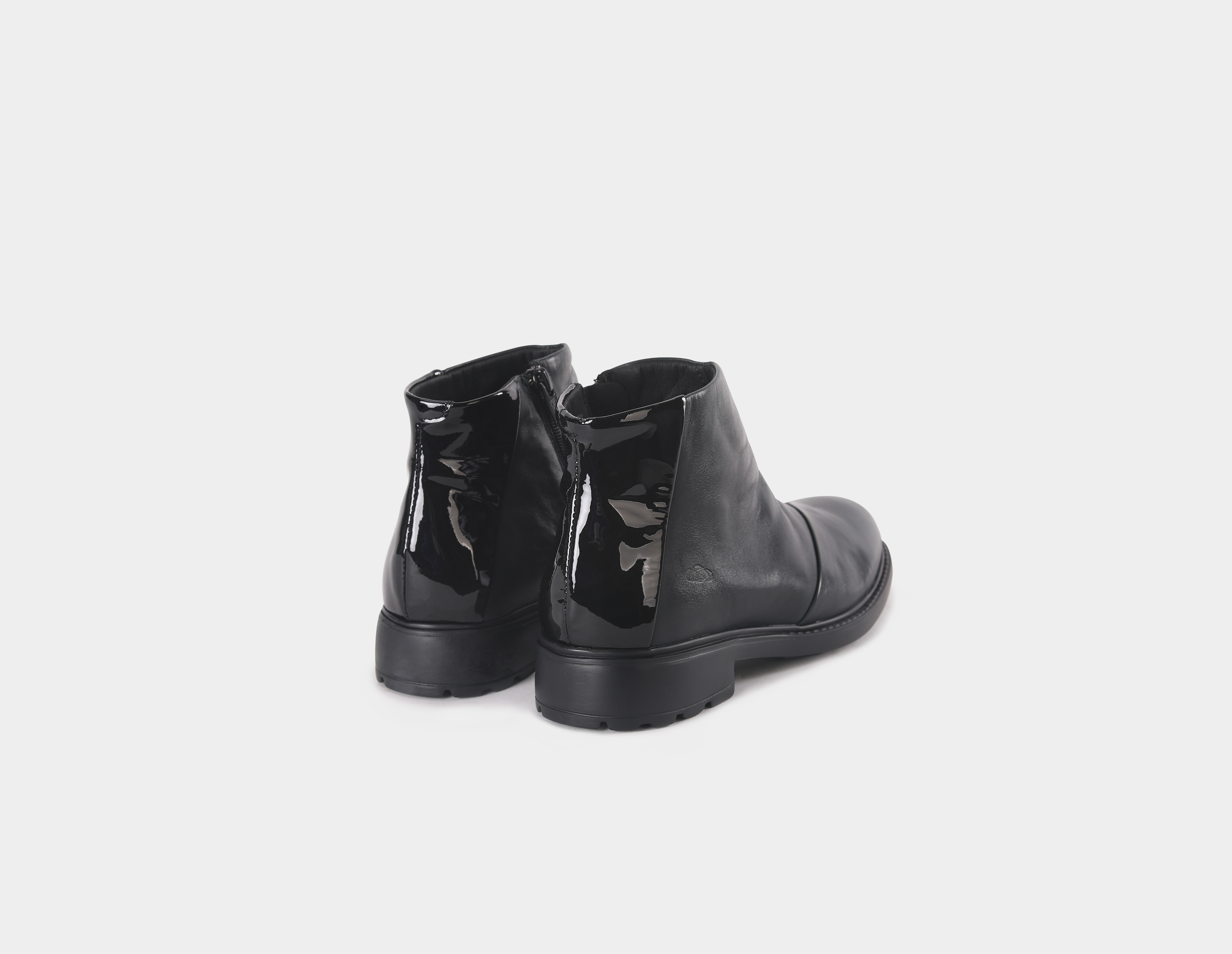 休闲短靴,风格中性干练。蜡感皮和漆皮的组合打破基础款的沉闷,为平日工作生活的搭配带来更多亮点,无论裤装还是裙装都能轻松搭配。