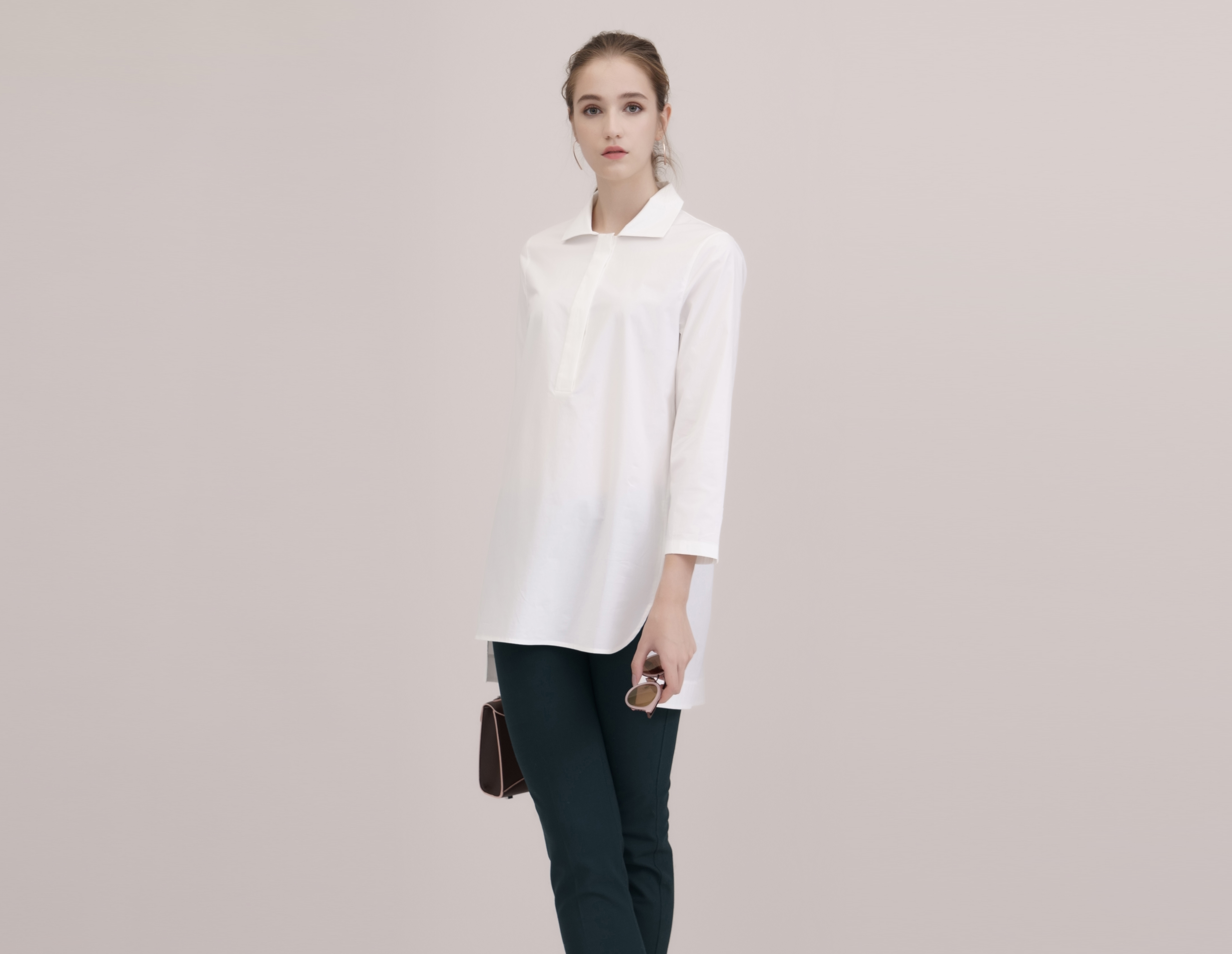 含蓄的暗门襟。钝角形状的衬衫领。知性而富于设计感。