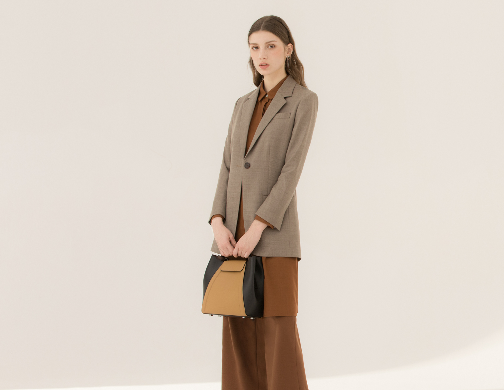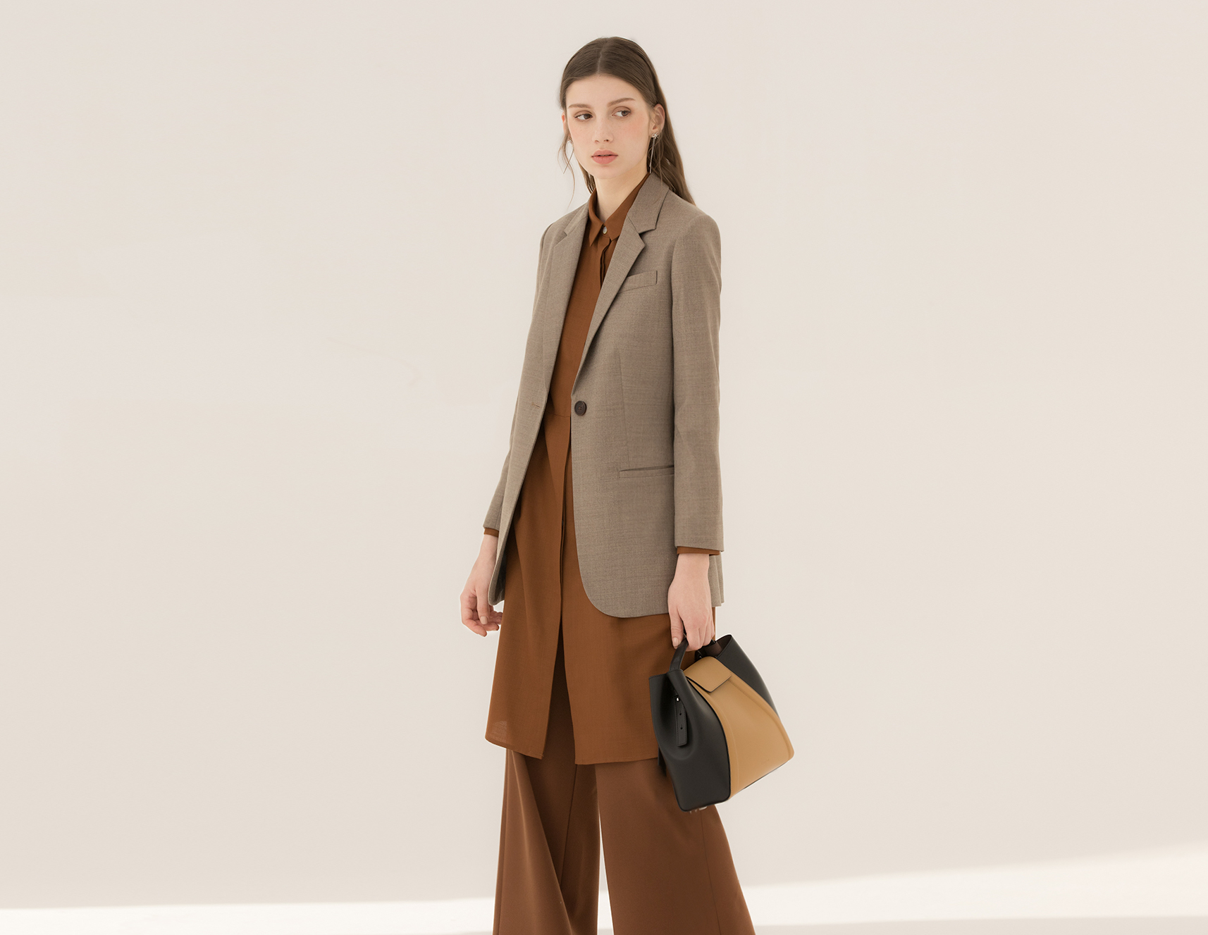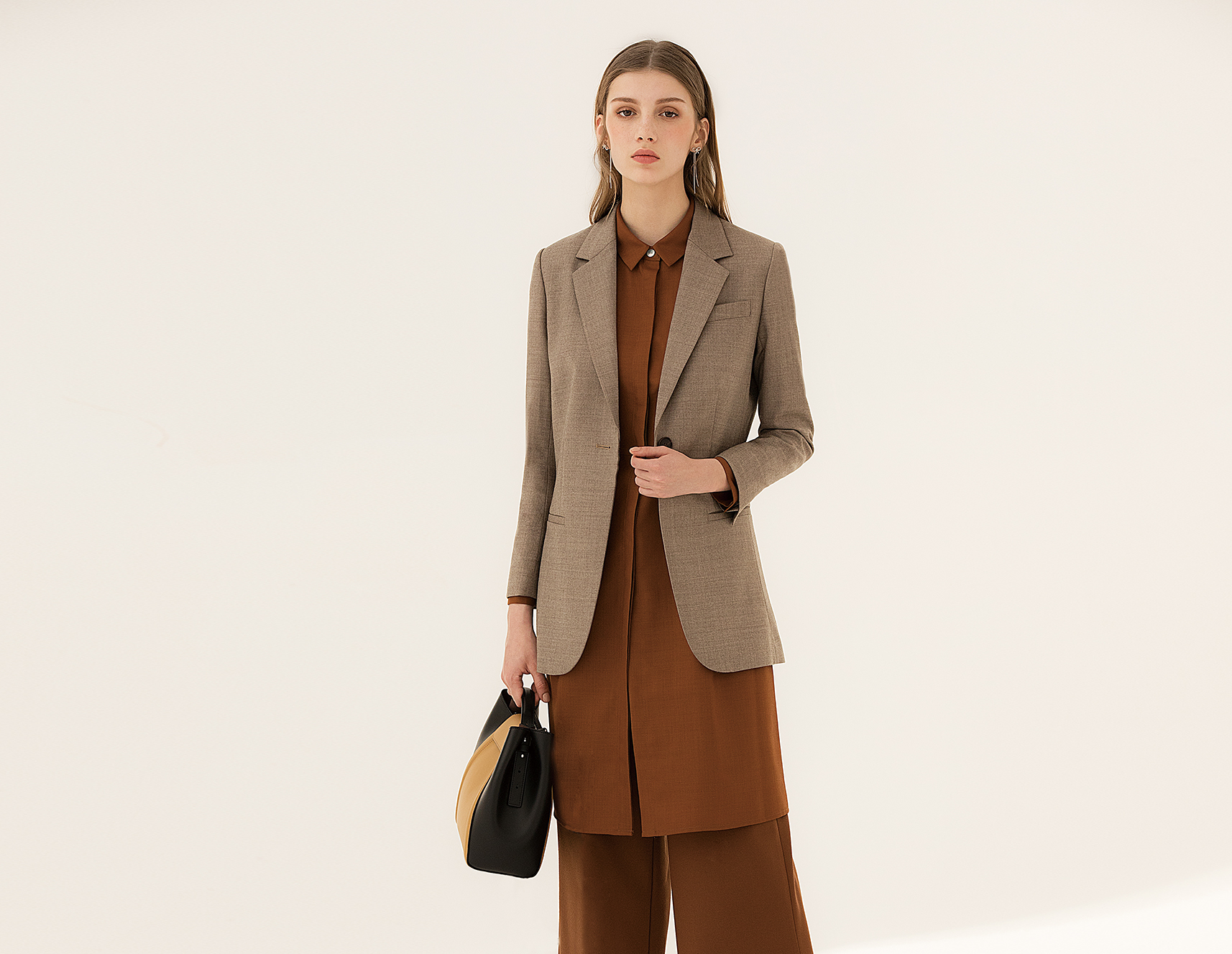 希尔瑞高级感混纺羊绒单扣西装, 微调后领型十分硬朗,版型符合人体工学,面料细腻光滑、看起来有隐隐光泽的商务套西。适合正式场合,体现知性女性气质,英姿飒爽,搭配高跟鞋进一步提升精致度。精致简单剪裁的希尔瑞西装裤,透露职场精英气质,简约的搭配提高气场又精致。