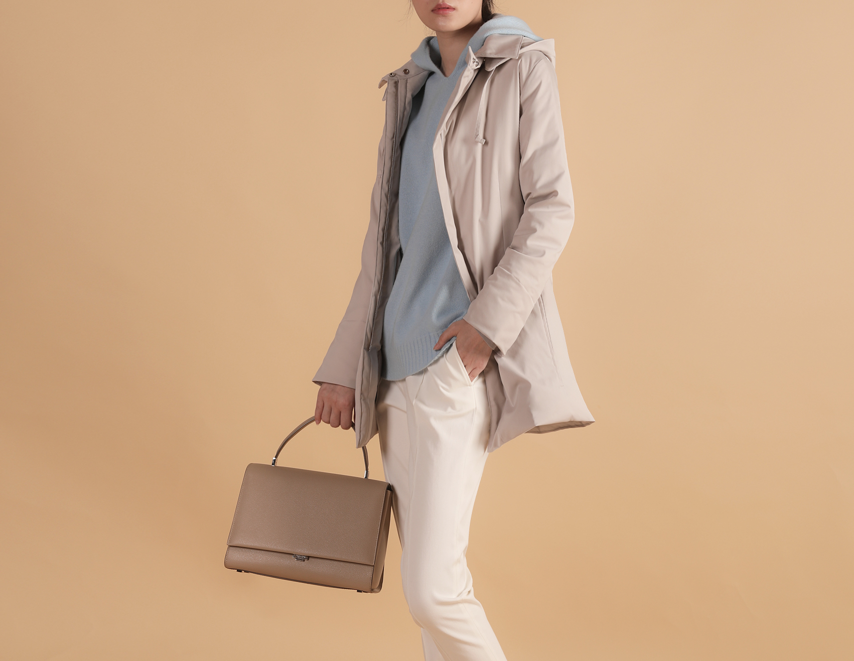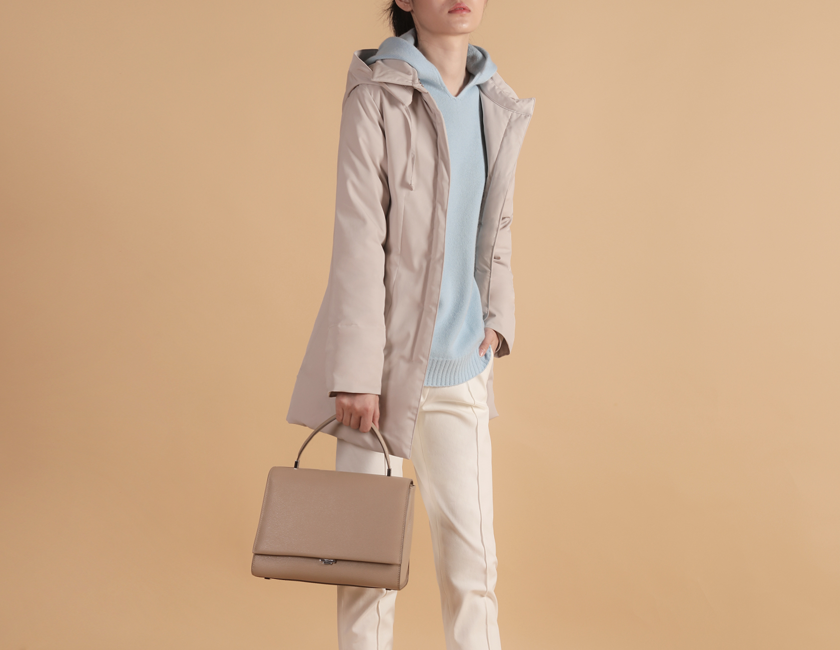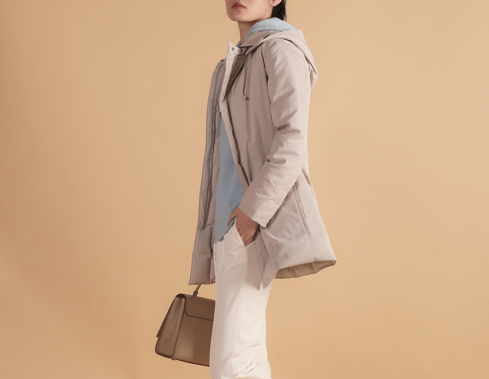 衣长恰到好处,遮住臀部的同时、又不会超过膝盖,削弱了传统羽绒服自身的膨胀感,利落又干练。选用了防泼水的面料,可抵挡寒风防潮,还加入了帽子的设计,是一款多功能的服装