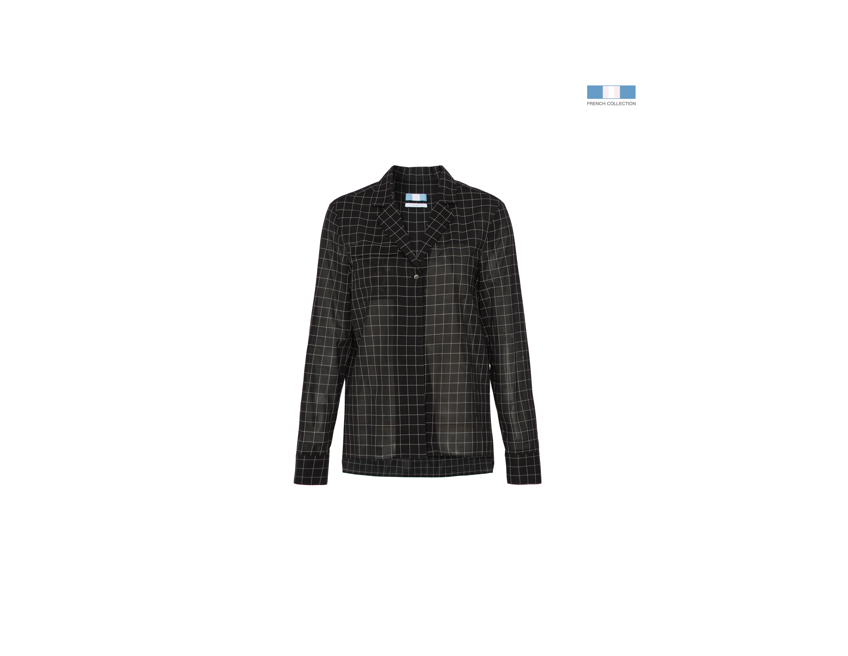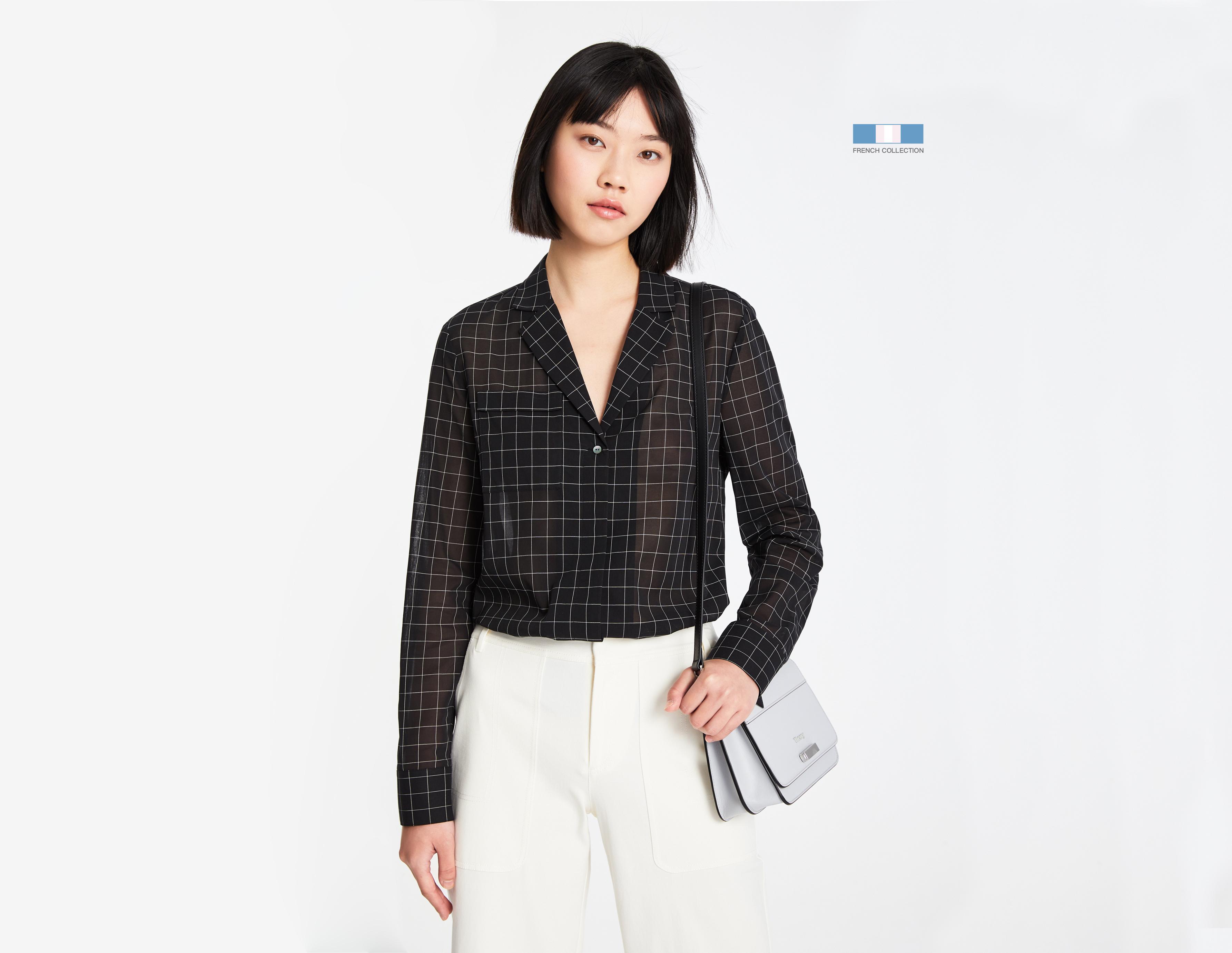 知性高雅的衬衫。翻领的设计美观而复古感十足。轻薄通透的全棉材质。加之隐约的格线令材质的高级感显而易见。