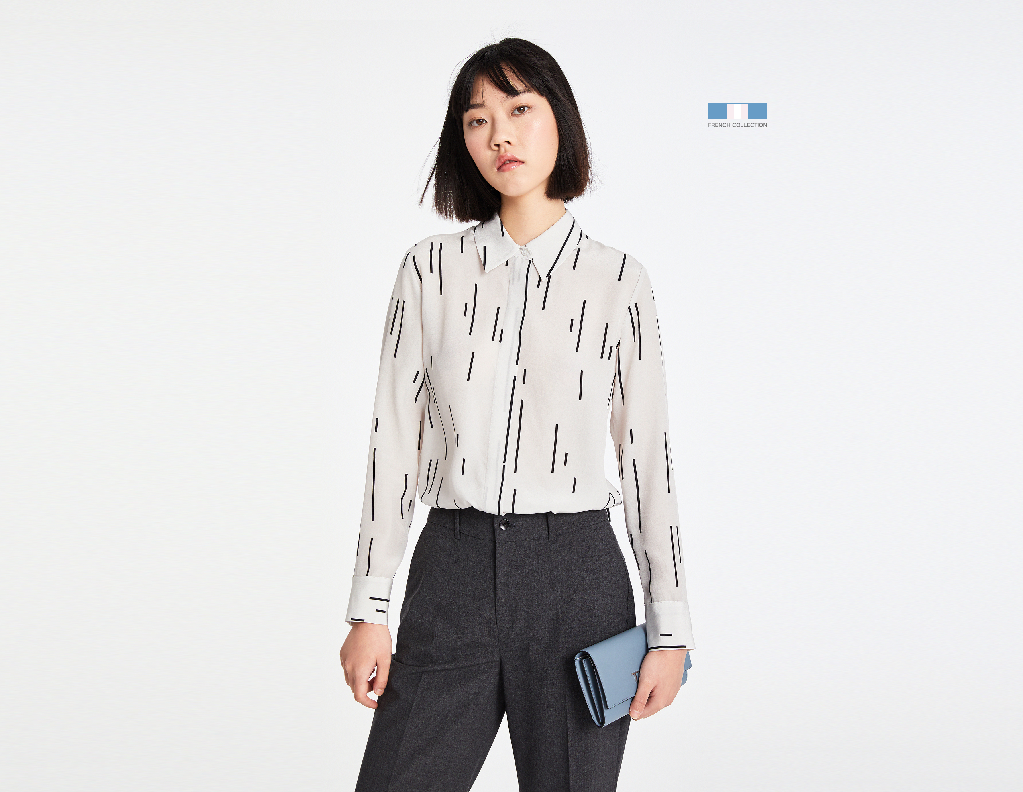 真丝印花衬衫是夏季的活力之选,搭配西装外套和单独穿着都是很好的选择。根据品牌风格自行研发设计的花型简洁的几何线条是识别度很高的品牌特色。