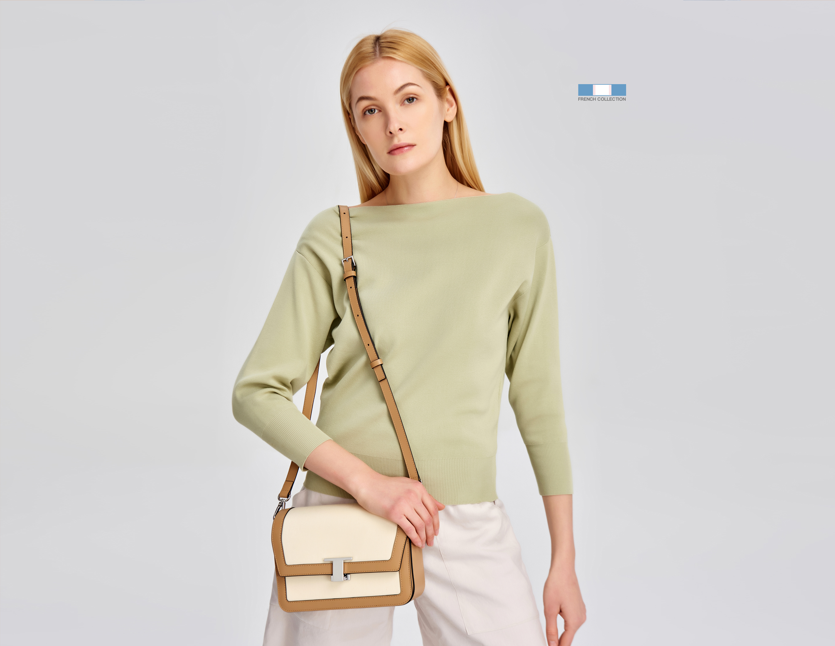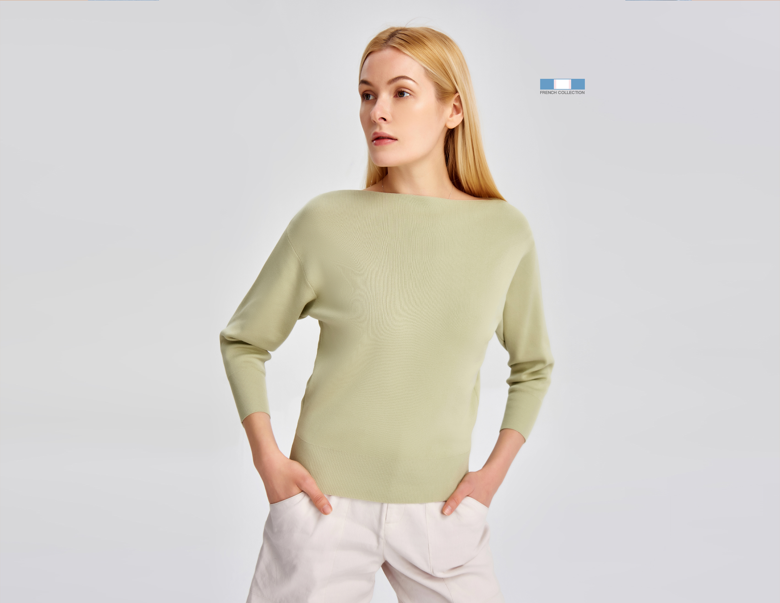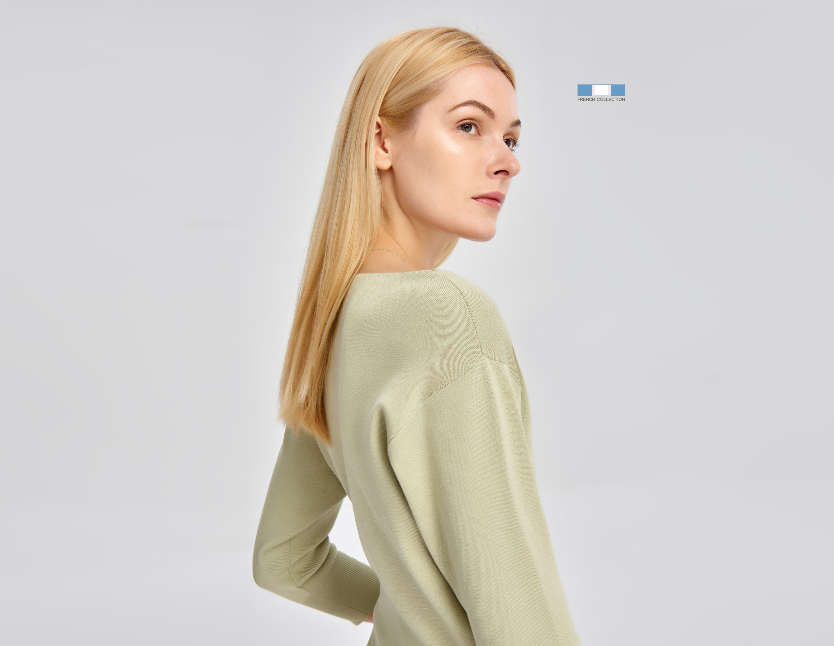 款式采用时尚流行的 一字领设计,运用当季流行的色彩,展现出现代知性职场女性,精致时尚干练的气质。